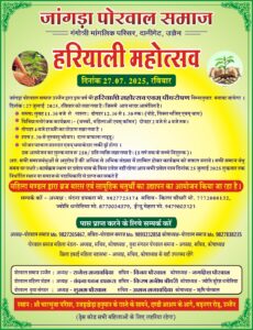 जांगड़ा पोरवाल समाज उज्जैन द्वारा दिनांक 27 जुलाई 2025 रविवार को निम्नानुसार हरियाली महोत्सव मनाया जा रहा हैं