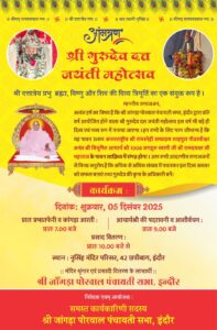 अत्यंत हर्ष का विषय है कि श्री जांगड़ा पोरवाल पंचायती सभा, इंदौर द्वारा प्रति वर्ष आयोजित होने वाला श्री गुरुदेव दत्त जयंती महोत्सव इस वर्ष भी बड़े ही दिव्य एवं भव्य रूप में मनाया जाएगा।