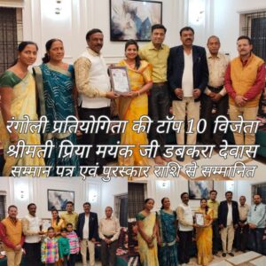 देवास अखिल भारतीय पोरवाल युवा संगठन द्वारा आयोजित राष्ट्रीय स्तर पर रंगोली प्रतियोगिता मैं टॉप 10 विजेता रही श्रीमती प्रिया मयंक जी डबकरा देवास को सम्मान पत्र एवं समान राशि पुरस्कार स्वरूप संस्था के संस्थापक श्री राजेंद्र जी संघवी प्रदेश अध्यक्ष अशोक जी पोरवाल जिला अध्यक्ष अंकित जी गुप्ता जिला उपाध्यक्ष अजय जी रत्नावत ने उनके निवास पर पहुंच कर प्रदान कर सम्मानित किया एवं बधाई दी
