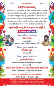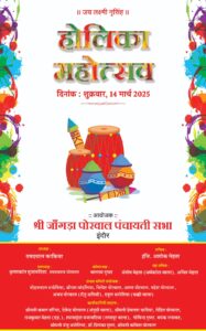 श्री जांगड़ा पोरवाल पंचायती सभा के तत्वाधान में होने वाले होली कार्यक्रम के अंतर्गत महिलाओं का फुलपाती कार्यक्रम 14 मार्च 2025 शुक्रवार को शाम 4:30 बजे रखा गया है 🎊 सभी महिलाएं नरसिंह मंदिर से 🎺गाजे बाजे 🥁और कलश के साथ प्रस्थान करेंगी समाज की सभी महिलाओं एवं ग्रुप से निवेदन है समय🕔 पर पधारे और हमारी संस्कृति को जीवंत रखे🙏🙏फुलपाती में बच्चे और बड़े दूल्हा दुल्हन बनकर ईसर गोरा के स्वरूप में तैयार हो कर आ सकते है🪆🪅 सभी अवश्य पधारे समय से पधारे🤗