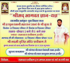 पितृ-पक्ष के अवसर पर पूज्यनीय पितरो के असीम आशीर्वाद से श्रीमद्भागवत कथा ज्ञान यज्ञ का आयोजन व्यासपीठ अलंकृत संत श्री हरशुकरामजी महाराज के श्रीमुख़ से होने जा रहा है। जिसमें समस्त समाजबंधु सादर आमंत्रित हैं, पधारकर अमृतपान का लाभ लेवे l 🙏🏻